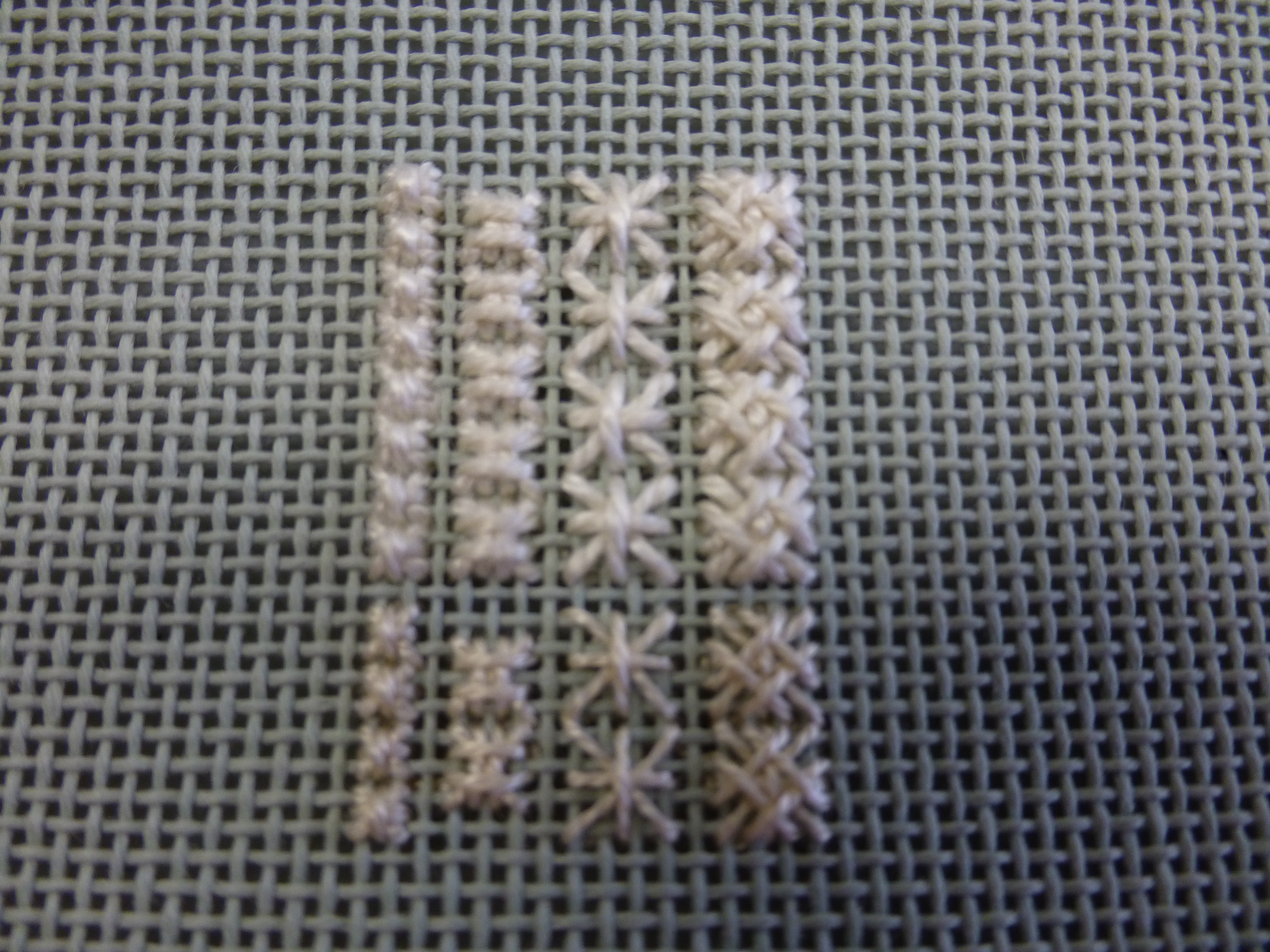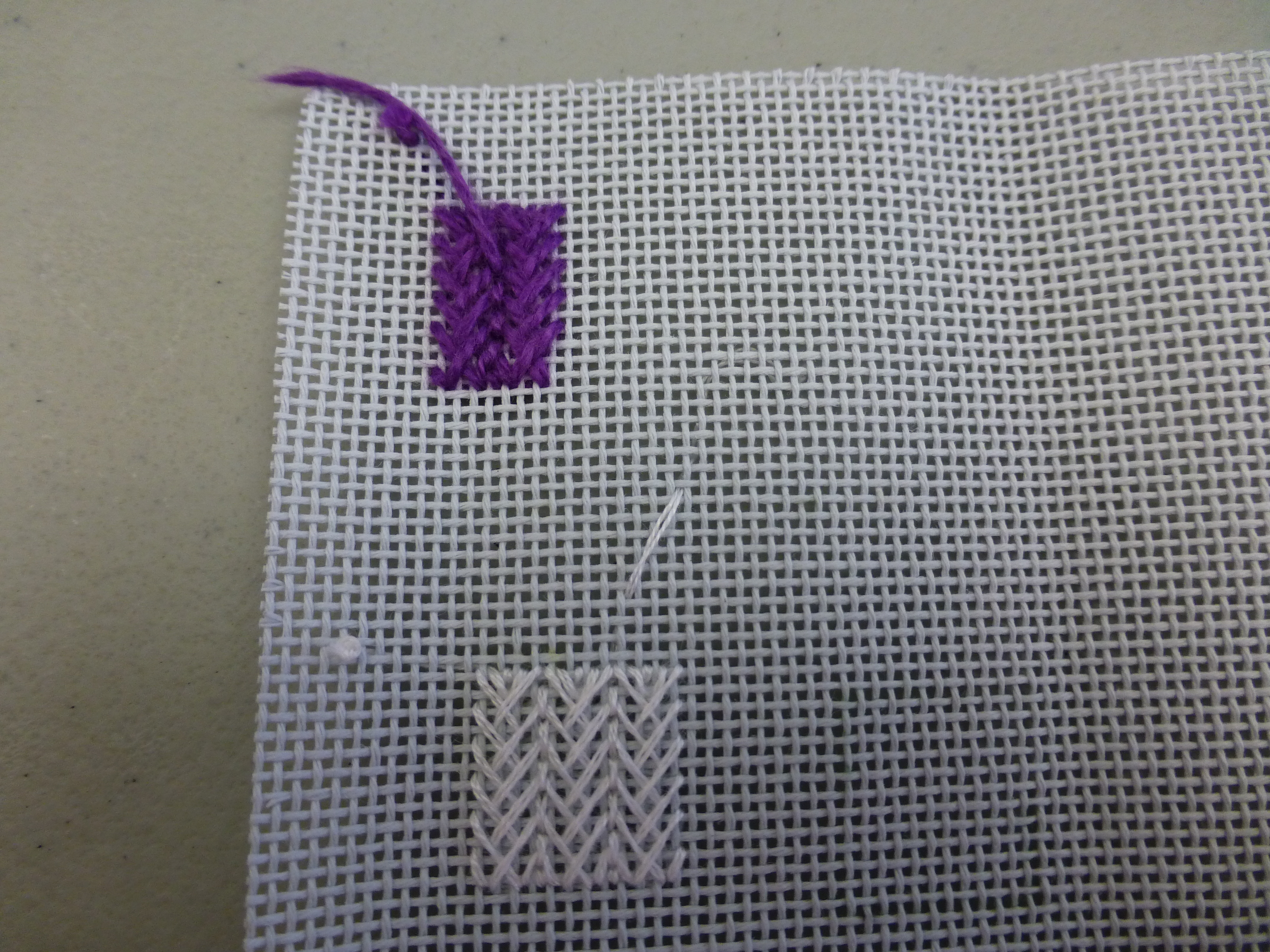 Oct 3 Blocks #7, the Zig-zag Satin Stitch, and #4, the Cross Stitch, with Kristeen Oct 17 ***All Guild workshop with Carolyn Barnett*** Nov 7 Nov 21 Cancelled due to weatherDec 5 Block #10, Tied Oblong Cross with Irene. Irene's method vs magazine is shown here. Dec 12 Town Hall Meeting, luncheon, talk - No Learn a Stitch - CANCELLED due to weather 2017Jan 16 Ray Stitch or Shell Stitch with Lorna - to see stitch, visit http://needlepointteacher.com/stitches/q-r/ray/ Jan 30 Block #11, Milanese Stitch with Ros taken from EAC magazine Summer 2016 vol 44, Num 4, page 38 Feb 6 Block#3, Fern Stitch Variation with Diane taken from EAC magazine Summer 2016 vol 44, Num 4, page 36. Sample Fern Stitch. Plus the eyelet stitch was taught. Two suggestions for eyelet stitch: count 1 to centre, then 2, 3, 4, 5 etc; OR count 1 to centre, then 3, 5, 7, 9 etc Feb 20 Block #5, Rhodes Squares with Jane taken from EAC magazine Summer 2016 vol 44, Num 4, page 36 Mar 6 Block #1 Smyrna Crosses over 3 threads, and #13 Smyrna Crosses over 2 threads & 4 threads with Debbie taken from EAC magazine Summer 2016 vol 44, Num 4, pages 34 and 38. Plus the Plaited Smyrna Cross. Handout. Sample stitches. Mar 20 Block #14, Norwich Stitch with Anjali taken from EAC magazine Summer 2016 vol 44, Num 4, page 39 April 3 *** Guild workshop (stitching on felted piece) with Beth Abbott*** April 17 Scotch Stitch with Mary Lou. Block #6 is Reversed Scotch Stitch taken from EAC magazine Summer 2016 vol 44, Num 4, page 36. Also there is a Handout showing the basic Scotch Stitch along with several variations. May 1 Pinwheel Stitch with Donna. May 15 Overlapping Cross Stitch with Gabrielle. Here is a sample. June 5,19 No Learn a Stitch Learn a Stitch Programme for 2017-18: Drawn Thread Embroidery